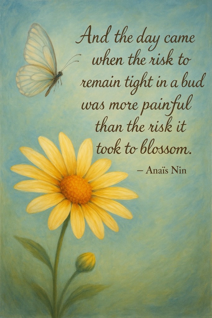 โAnd the day came when the risk to remain tight in a bud was more painful than the risk it took to blossom.โ โ Anaรฏs Nin